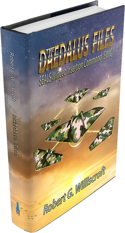 Can you drop from Low Earth Orbit (LEO) with just a hardshell wingsuit? Navy SEAL Derek “Tiger” Baily and his SEALS Winged Insertion Command (SWIC) develop an experimental Gryphon hardshell wingsuit that can do just that. Eventually, when the presidential front-runner is seized by pirates for ransom, Baily’s 6-man SWIC team must hurtle around the world, staging critical re-entry for a rescue, challenged to solve life-or-death problems with only seconds to spare. Can they survive? Will they effect the rescue? Join Tiger Baily through all four adventures in sci-fi master Robert G. Williscroft’s Daedalus series, now collected for the first time as The Daedalus Files: SEALS Winged Insertion Command.